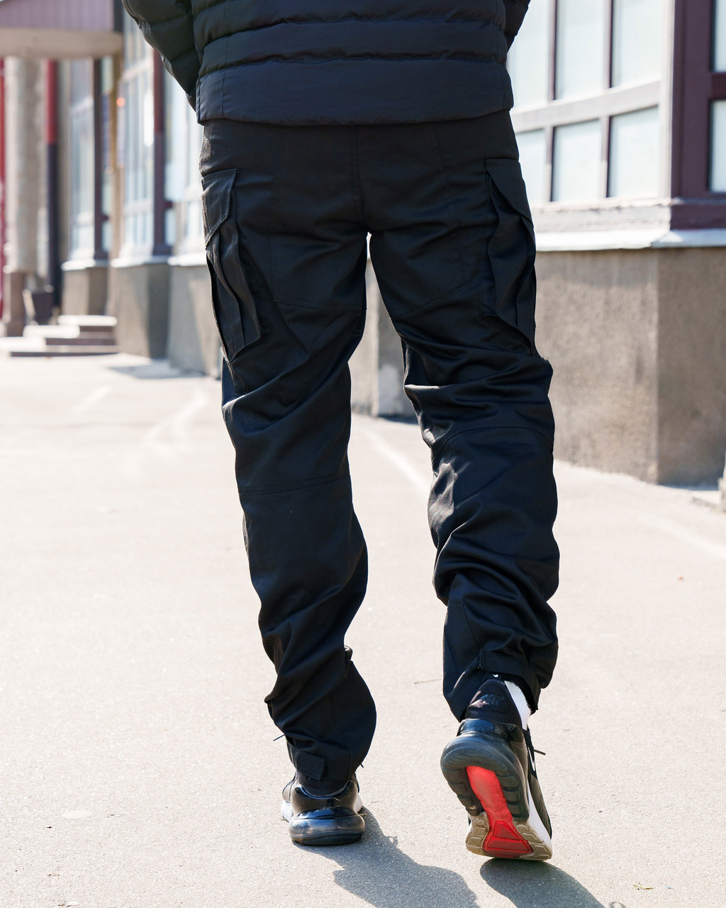Зручні та функціональні штани-карго — ідеальний вибір на кожен день. Виготовлені в урбаністичній стилі. Є 8 кишень — по 2 прорізних спереду та ззаду, 2 внутрішні бічні, і 2 накладні з клапанами на липучках із боків штанин, на рівні стегон. Пояс із петельками під ремінь. Ширина штанини регулюється патою на липучці. Коліні та нижня частина внутрішнього бічного шва посилені додатковими накладками з основної тканини. Тканина САРЖА, дуже легка , приємна в носінні, склад 70%хб/30%pe. Колір ЧОРНИЙ.