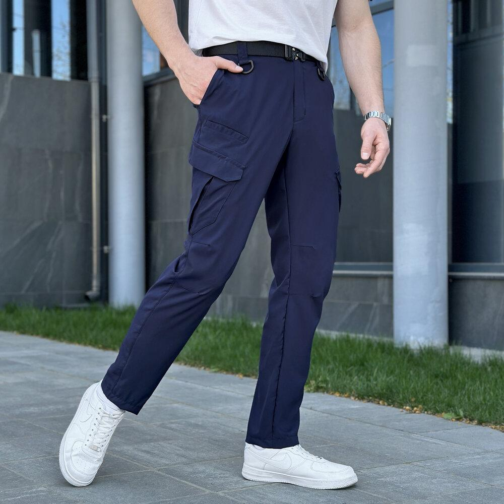 Зручні та функціональні легкі  штани — ідеальний вибір на кожен день. Виготовлені в стилі Regular. Є 6 кишень —  прорізні:  ззаду та на правій штанині над основною кишенею, 2 внутрішні бічні  и  2 накладні з клапанами на липучках із боків штанин, на рівні стегон. Пояс штанів із петельками під ремінь і півкільцями.  З боків пояса вставлена гумка. Анатомічний крій колінної частини створює додаткову зручність у носінні й перешкоджає витягуванню тканини  і деформації форми виробу..  Тканина плащова Soft,   дуже легка, не мнеться  , приємна в носінні, склад 100% пе. Колір  ТЕМНО-СИНИЙ. Штани ідеально підійдуть для працівників різних силових стуккткр, офісів, управлень.