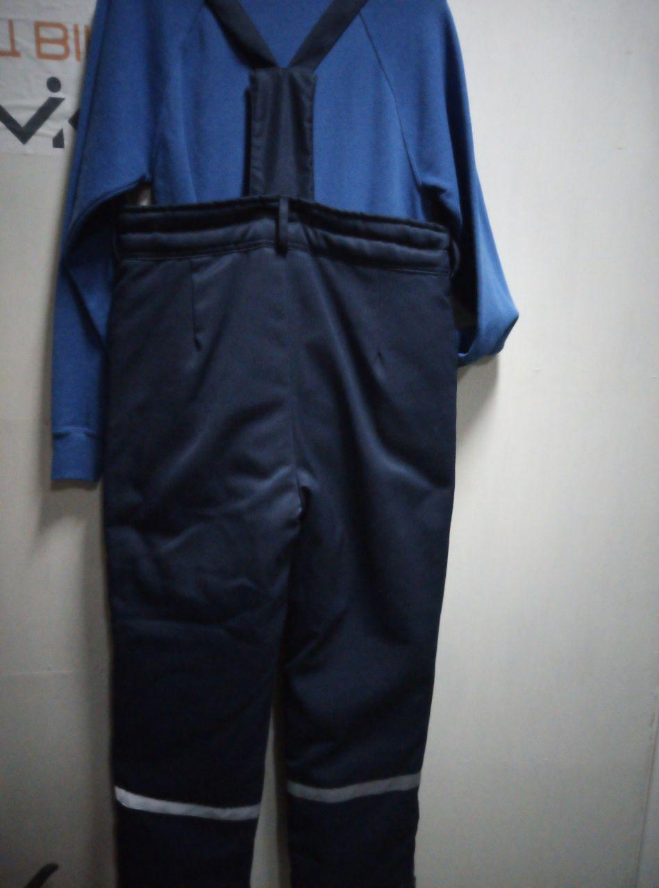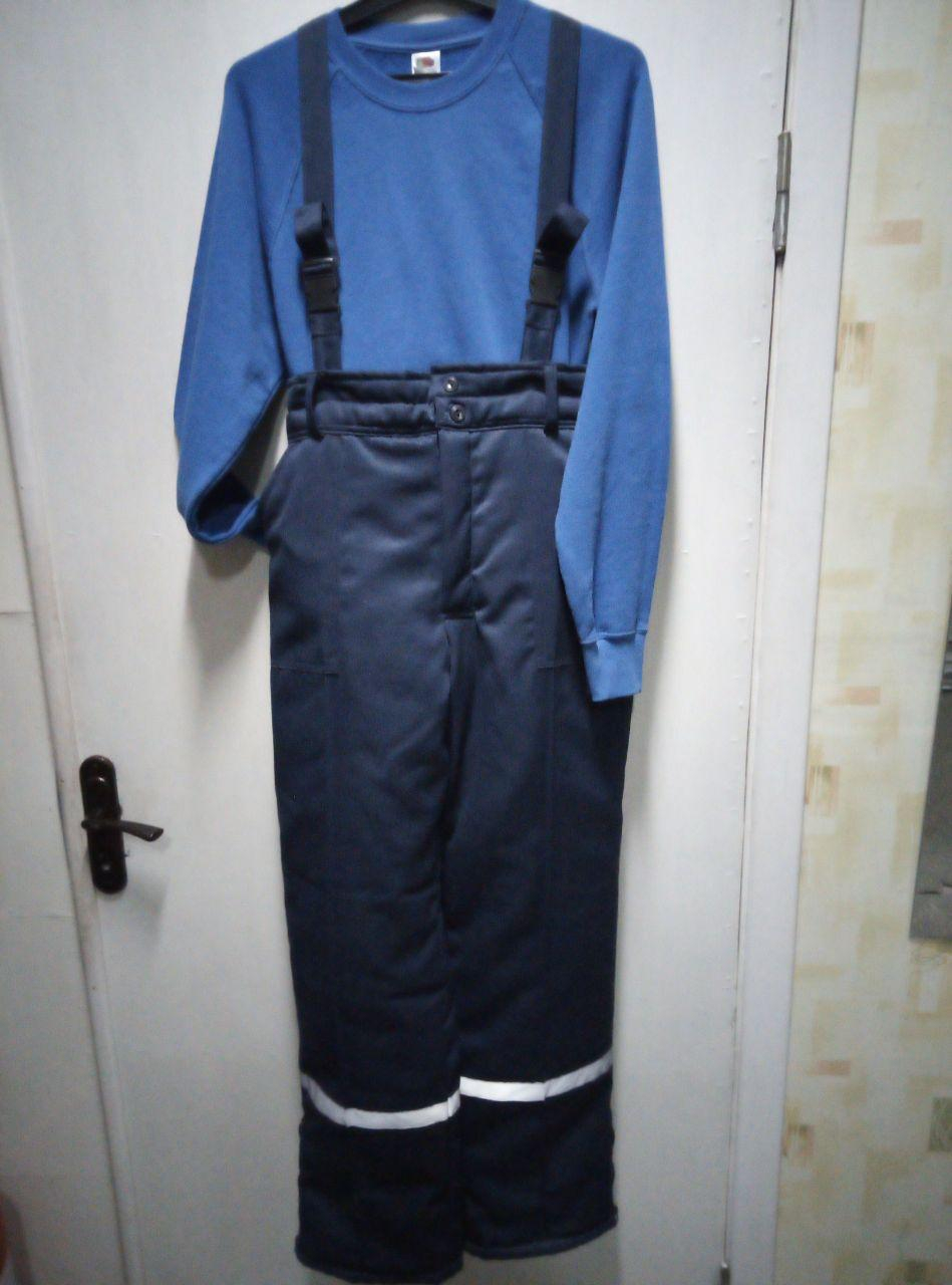 Штани робочі, утеплені синтепоном, прямого крою. Є 2 накладні кишені. Гульфик на блискавці. Високий пояс захищає спину від холоду. Внизу штанин розташовані світловідбивні стрічки. Штани мають знімні бретелі (кріплення на ґудзиках). Ширина штанин знизу регулюється за допомогою "блискавки".