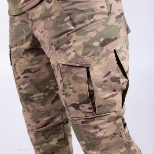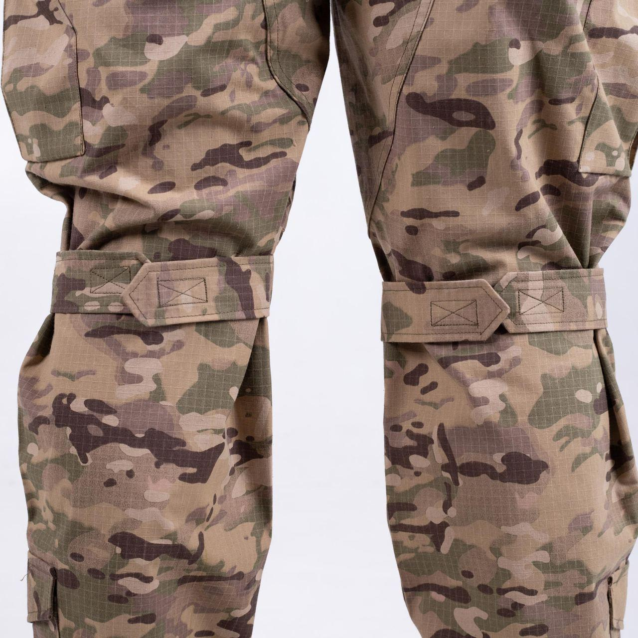 Штани з дуже зручною посадкою, що не сковують рухів. Є по 2 об'ємні накладні кишені з боків штанин, вище та нижче коліна, закриті клапанами на липучці. Пояс штанів із патами на липучках із боків і широкими петельками під ремінь. Штанини внизу рівні. На колінах нашиті підсилювальні накладки з входом для наколінників. Ззаду на рівні коліна є регулювальний хлястик на липучці. Тканина РІП-СТОП склад 50%хб/50% пе. Рис. МУЛЬТИКАМ