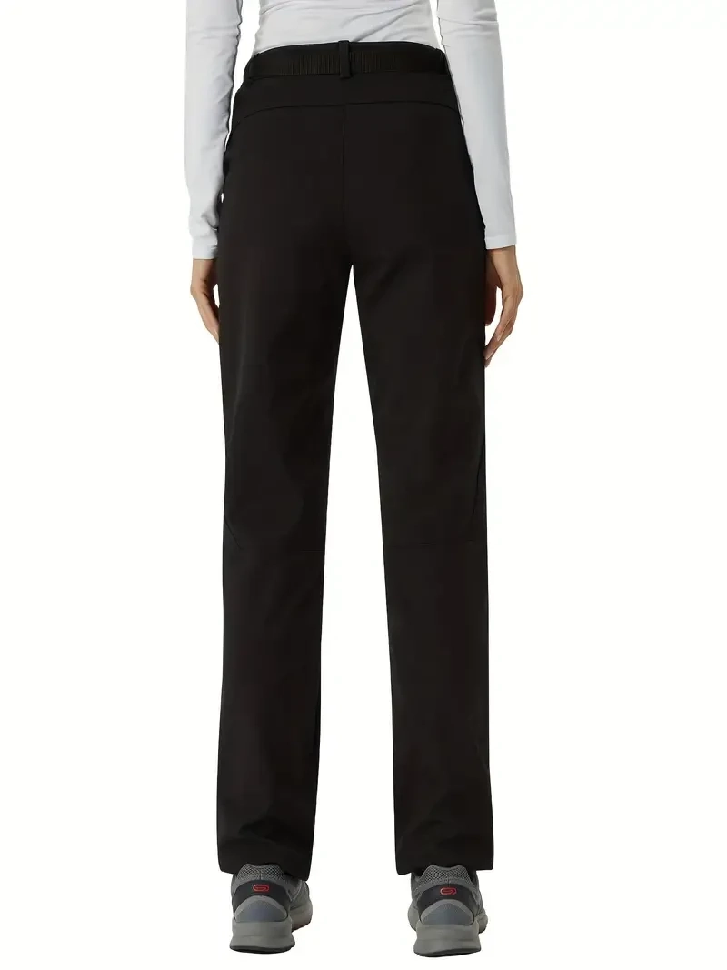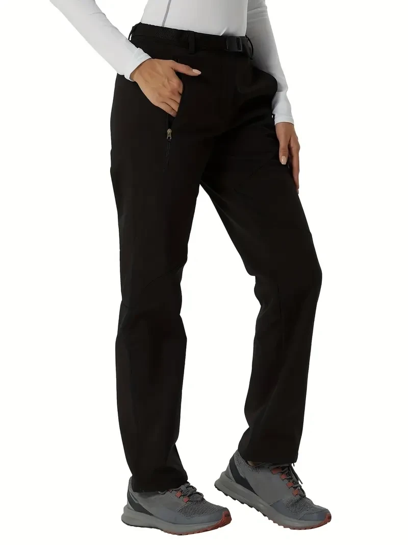 Штани жіночі, осінь-зима легкі, теплі, зі зручною красивою посадкою, виготовлені з тк. СОФТШЕЛЛ ( сучасний матеріал з міцної мембранної тканини зверху та теплого мікрофлісу всередині, що максимально зберігає тепло та захищає від вологи та вітру). Мають 2 внутрішні бічні кишені на блискавці. Пояс штанів на гумці з боків + м'який ремінь з пряжкою-карабіном, що легко застібається. . Низ штанів рівний. Передні половини штанів зшиті з декількох фігурних частин, що надає їм цікаву форму і зручність у носінні .