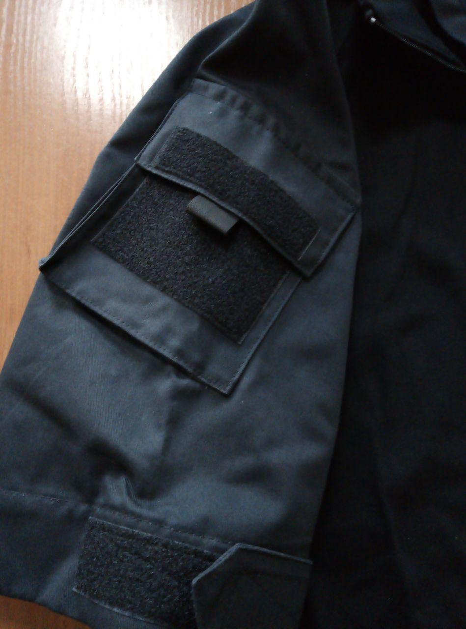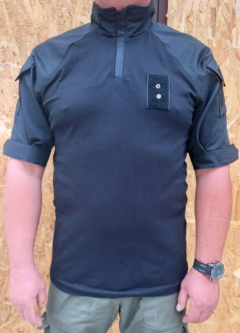 Сорочка для поліції з коротким рукавом. Спинка, груди - трикотажне полотно, 100% бав ,щільн.160 гм2, колір ЧОРНИЙ. Рукава, плечі, комір -  тканина, що дихає, є 70% бав/30% пе.  Рукава з об"ємними  кишенями, липучка для шевронів. Комір -стійка. Застібка на блискавці.  Довжина по спинці 75 см.