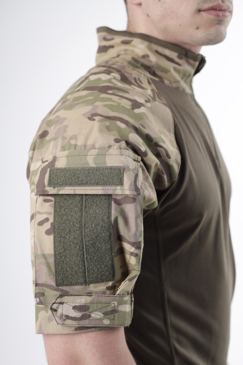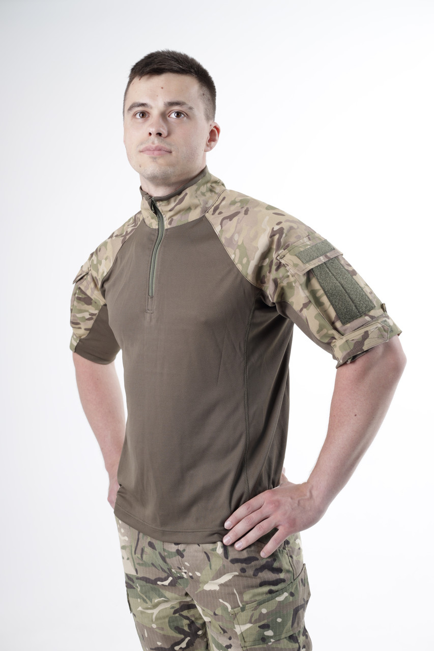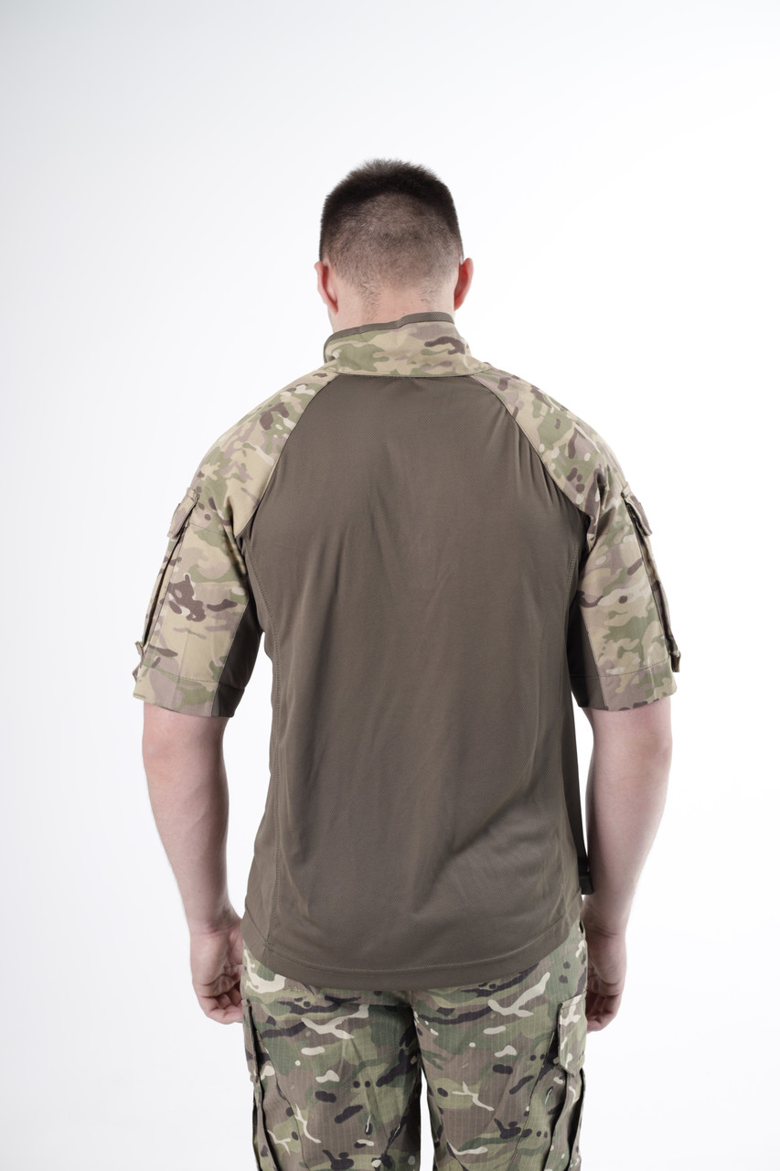 Сорочка тактична літня з коротким рукавом. Спинка, груди, внутрішня частина рукава  — м'яка повітропроникна тканина сітчастої фактури-COOLMAX, цв.ОЛИВА. Рукави, плечі, комір —  тК.РІП-СТОП, забарвлення МУЛЬТИКАМ. Комір-стійка на блискавці. На обох рукавах є  кишені з клапанами на липучці  і панелі велкро для шевронів.  Ширина рукава регулюється патою з липучкою.