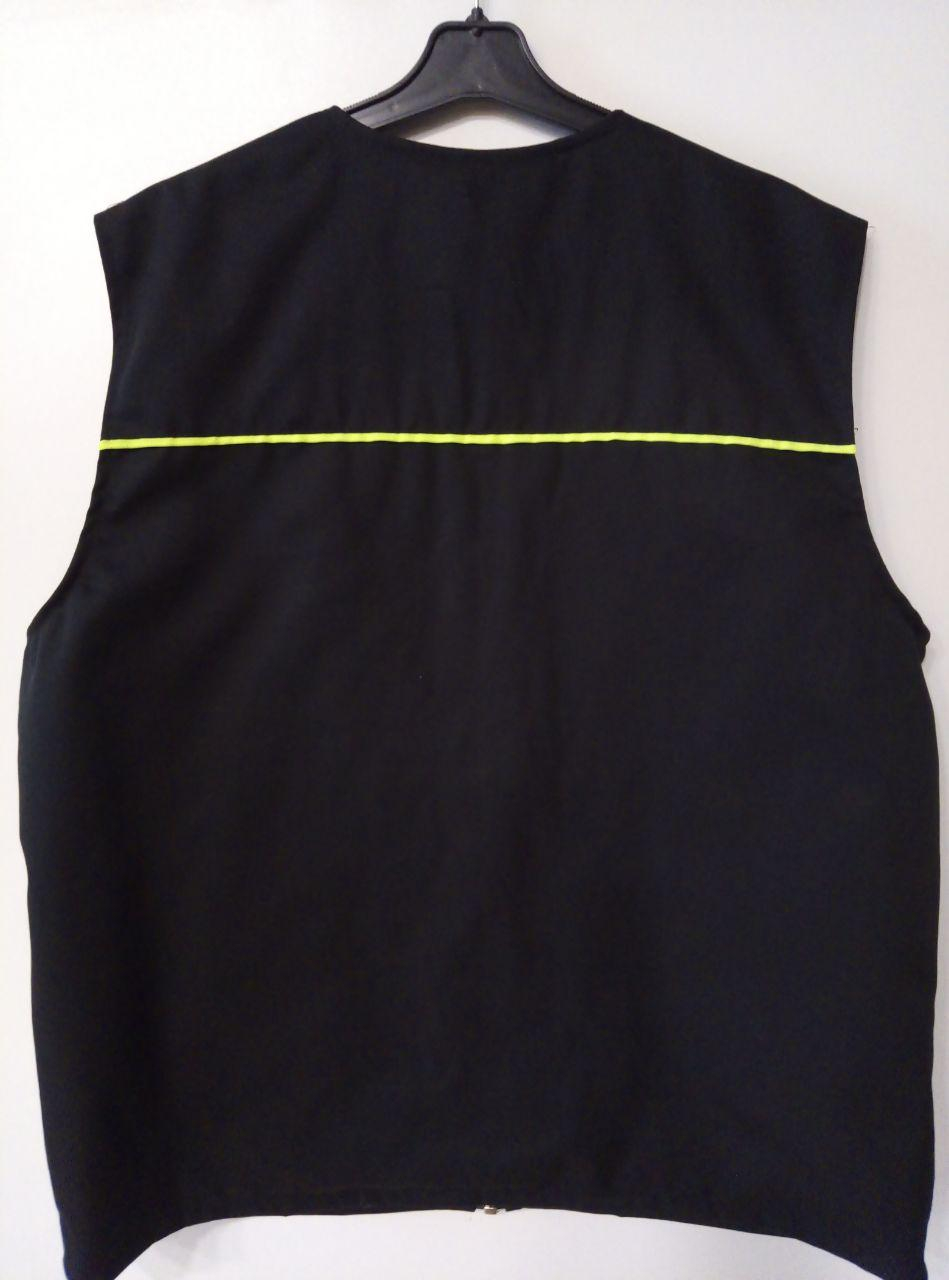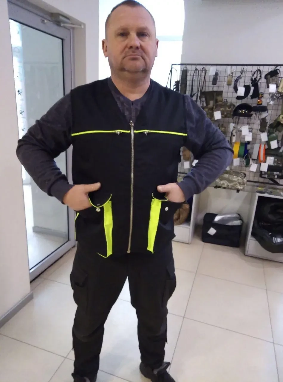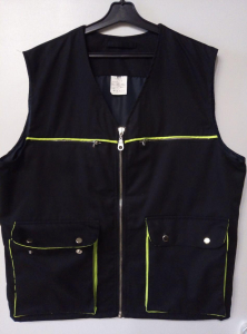 Жилет  чоловічий комбінований, на підкладці. Колір ЧОРНИЙ, оздоблення — кант на кокетках і "глибини" кишень — лимонного кольору. Є 2 великі об'ємні кишені з клапанами на кнопках із боків виробу, і 2 нагрудні приховані кишені на блискавці. Родзинку надає якісна фурнітура — металічні блискавки  ( центральна застібка та блискавки нагрудних кишень. Жилет виготовлений із високоякісної тканини ТРОН з масло-водово-відштовхувальним просоченням, склад 60%хб/40% пе.