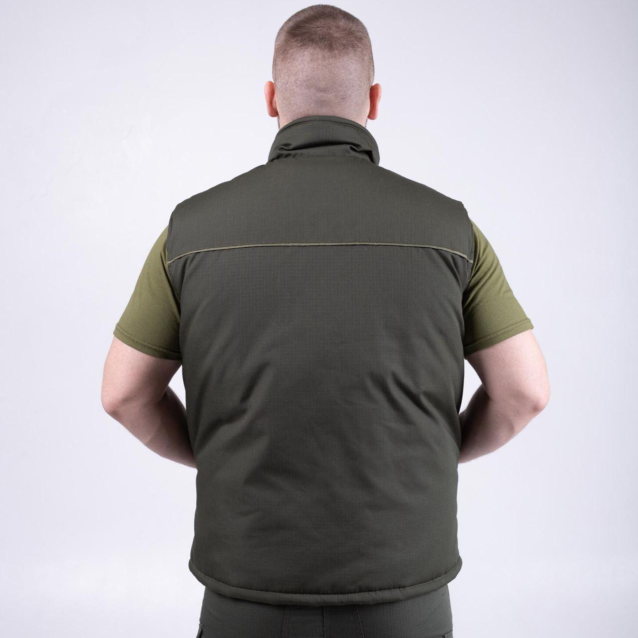 Жилет утеплений із коміром-стійкою і 4 кишенями, довжина до середини стегна, застібка-блискавка, закрита вітрозахисною планкою на кнопках. Внутрішня частина коміра з флісу. На кокетках і клапанах нагрудних кишень оздоблювальний кант на тон світлішої тканини.Ніжні кишені-листочки. Тканина верху-РІП-СТОП, міцна на розрив, склад 80%pe/20%хб, утеплювач — синтепон 200 гм2. Колір ОЛИВА.