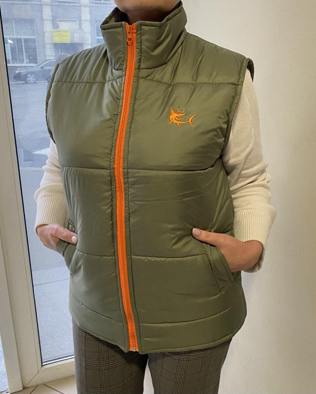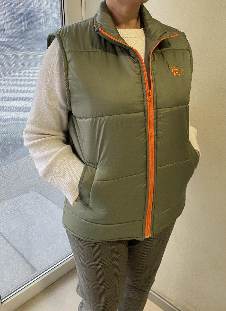 Жилет утеплений (чоловічий/жіночий) . Комір-стійка, кишені-листочки, довжина до середини стегна. Тканина верху -плащева ДЮСПО, утеплювач - синтепон 200 гм2. Колір - СВІТЛА ОЛИВКА. Застібка на блискавку контрасного помаранчового кольору. Зліва на грудях такого ж кольору вишита Акула.