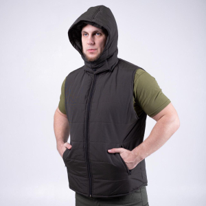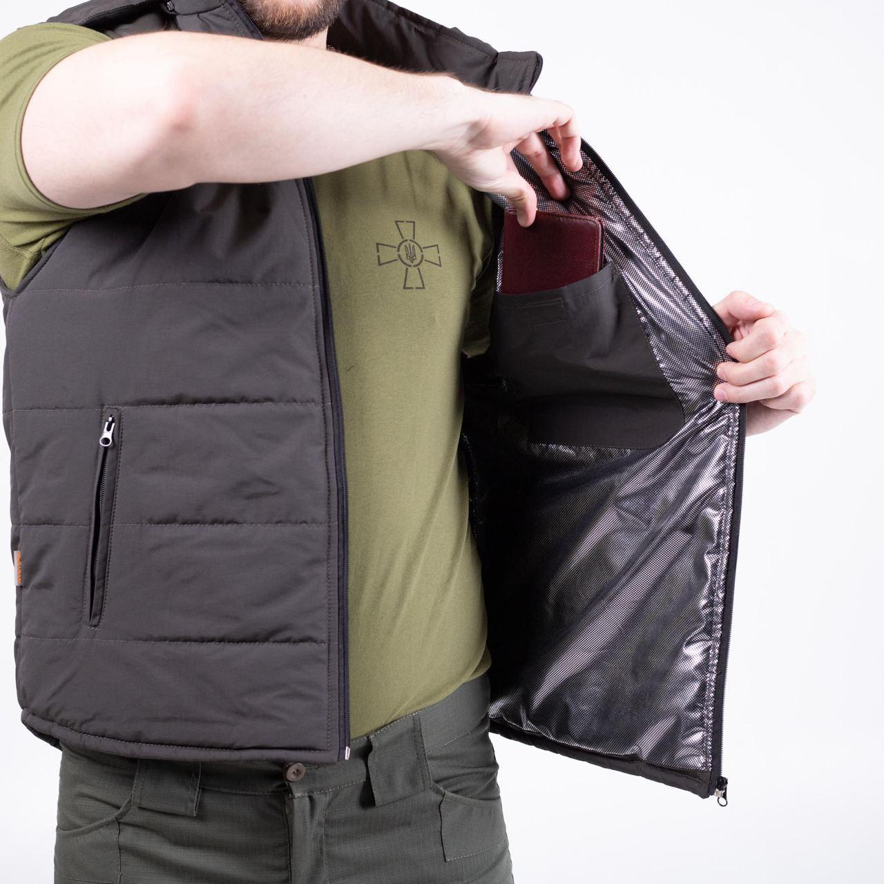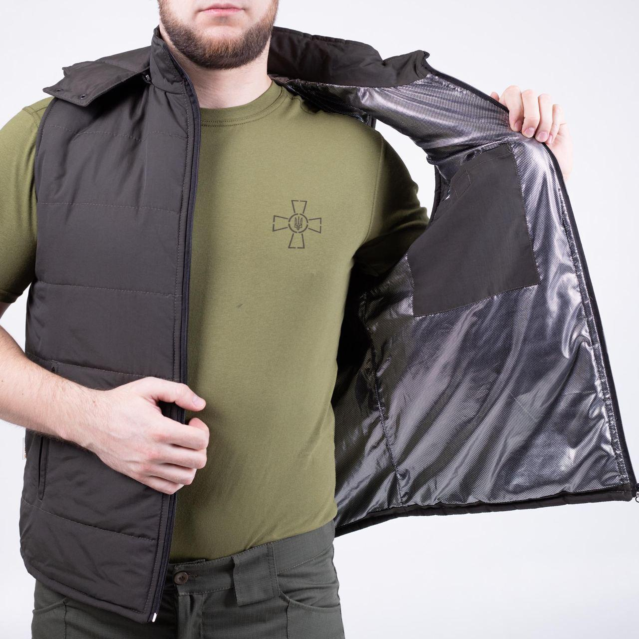 Жилет утеплений із коміром-стійкою і відстібним капюшоном, довжина до середини стегна, спинка подовжена, застібка-блискавка.. Нижні кишені-листочки,на молнії. Тканина верху-плащова "ТАСЛАН", проклеєна трикотажем, міцна на розрив, з водостійким просоченням, склад 100% пе , утеплювач — шерстепон 200 гм2. Колір ХАКІ. Особливістю виробу є унікальна фольгована підкладка Omni-heat , яка робить жилет надзвичайно теплим.