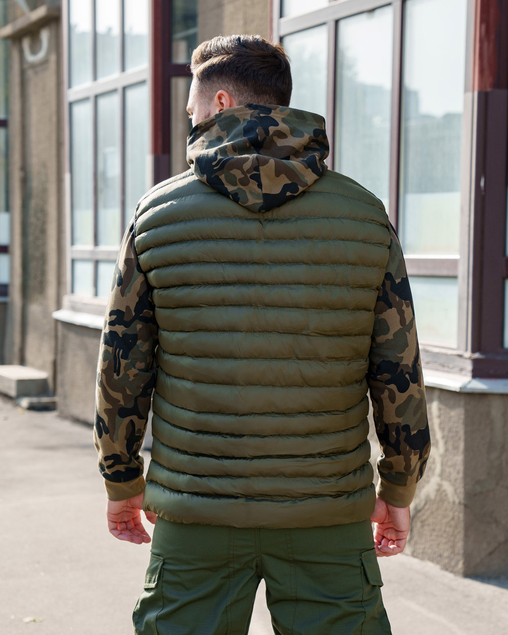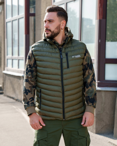 Жилет утеплений із коміром-стійкою, довжина до середини стегна, застібка-блискавка. Кишені — прорізні, на блискавці — один нагрудний і два нижні бічні, а також внутрішній, на лівій полиці. Тканина верху — болонья, склад 100% пЕ, утеплювач — силікон.. Колір ХАКИ. Особливістю виробу є унікальний фольгований підклад Omni-heat, який робить жилет надзвичайно теплим.