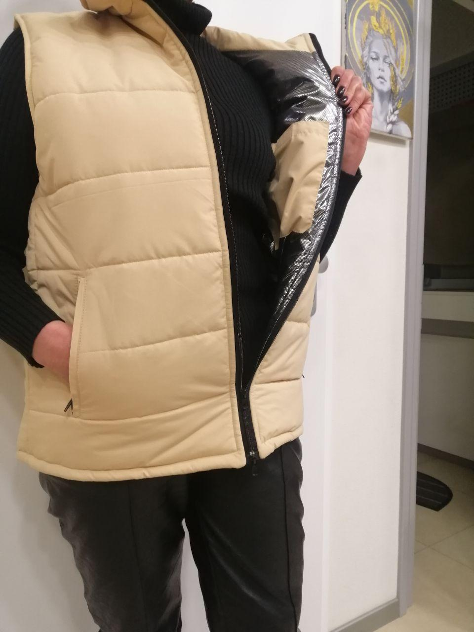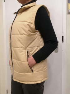 подовжена, застібка-блискавка. Жилет має дві прорізні кишені на блискавці та одну спідню, зліва. Тканина верху - плащівка  ДЮСПО, склад 100%пе, утеплювач - шерстепон 200гм2. Колір БЕЖ. Особливістю виробу є унікальний фольгований підклад Omni-heat, що робить  жилет надзвичайно теплим.